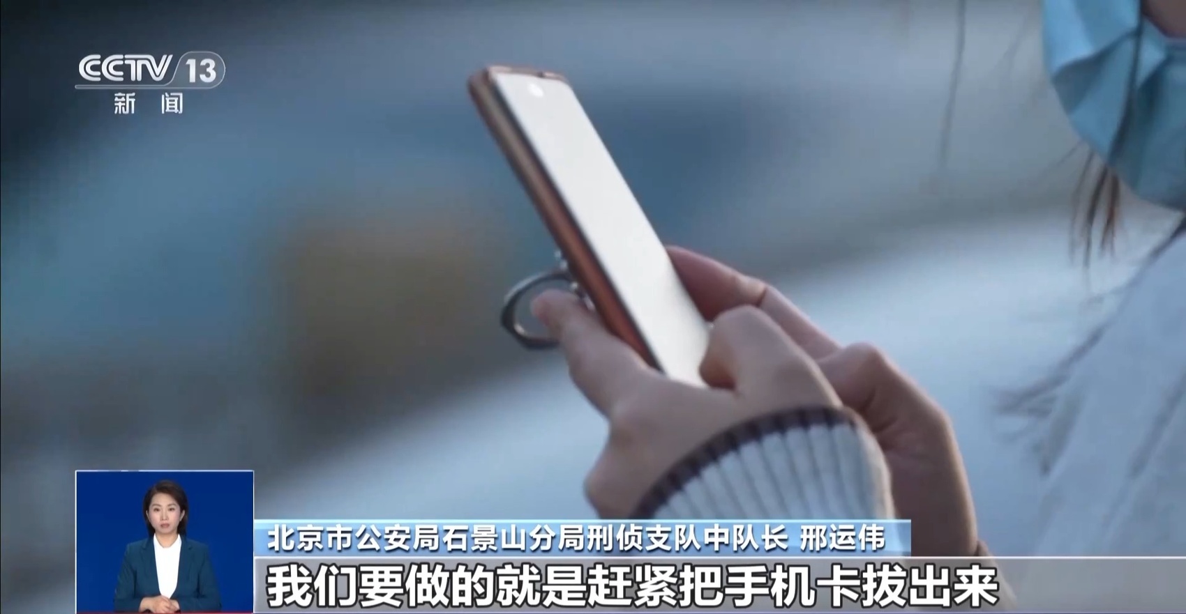 北京市公安局石景山分局刑侦支队中队长 邢运伟:手机被远程控制或者黑屏的话,关机是关不了的,我们要做的是,赶紧把手机卡拔出来,如果连着家里Wi-Fi,一定要把Wi-Fi给关了,这样对方就不能肆意操作我们的手机了。下一步就要及时给各个银行打电话,把我们的银行卡赶紧挂失,以免对方还继续刷我们的钱。随后就要赶紧打110报警,让警方及时对银行卡进行止付。