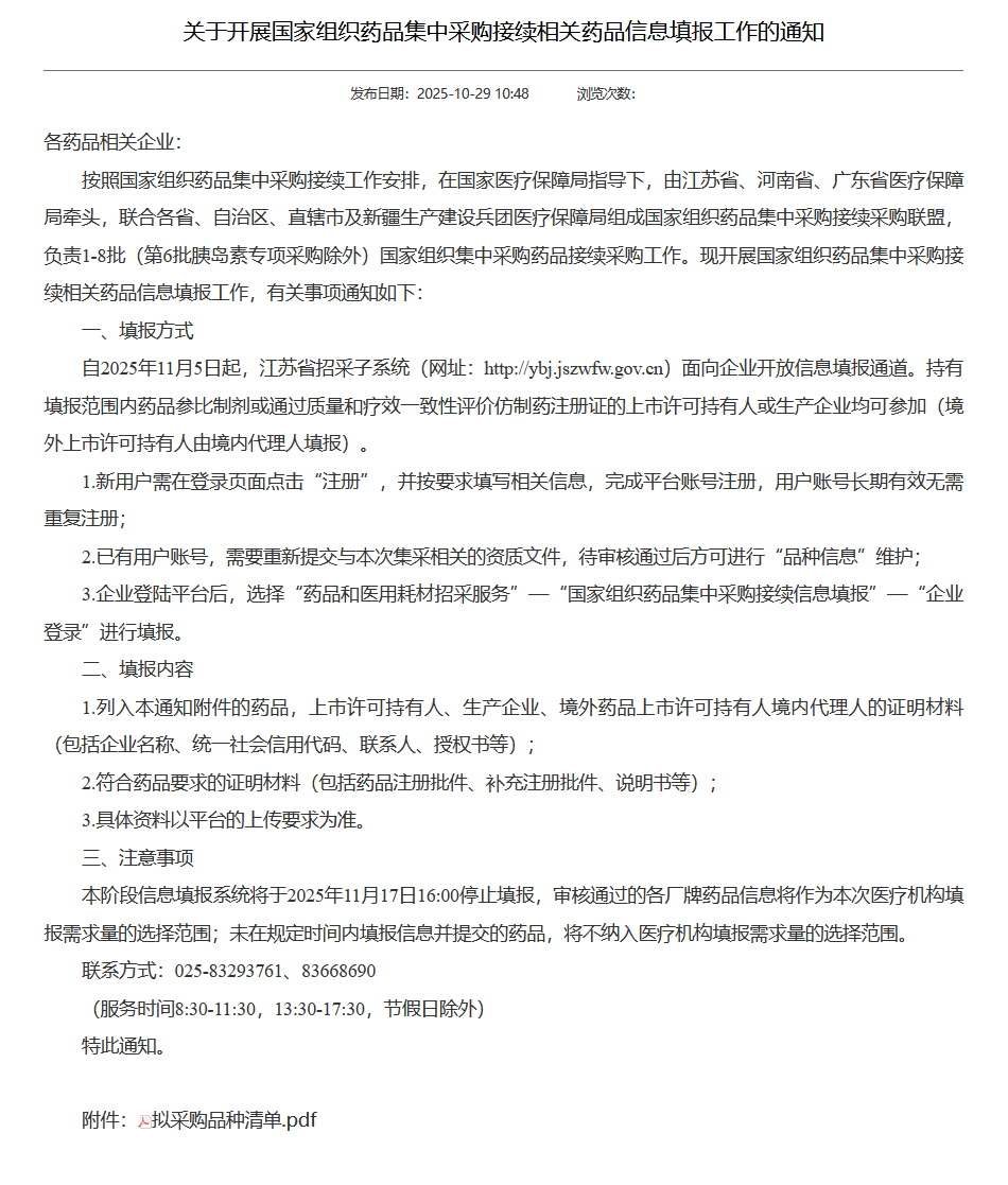 附件:拟采购品种清单.pdf 一、全国联盟集采接续启动 江苏牵头搭建填报平台
