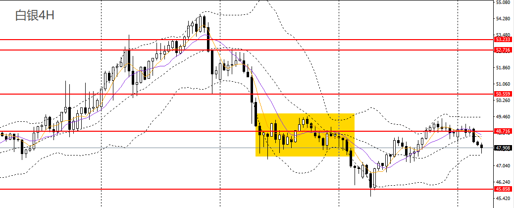 白银收倒锤阴线,徘徊于5日、10日均线附近,日线RSI仍位于50左右,4小时未破前高,且刺破48关口支撑,短线趋势再度转弱,空单可继续持有,后市有望进一步回踩47.50-47.70。