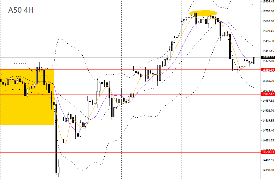 A50小幅回升,于日线布林中轨附近企稳,15000关口附近仍存在较强支撑,短线空单可考虑减仓,稳健者可暂时观望。