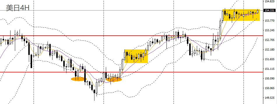 美日昨日小幅回升,4小时逼近前高压力,后市大概率将酝酿空中加油,153.80-154一带企稳可进多,如升破154.40,可看多至154.80-155。