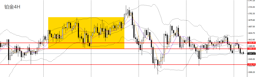 铂金冲高回落,日线呈头肩顶,1600附近仍面临强压,如持续承压于下方,后市预计将下探1530-1550。