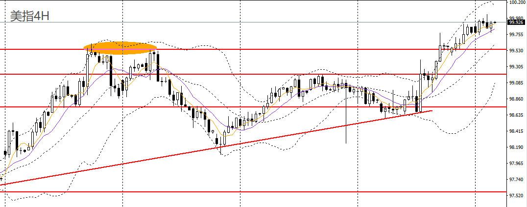 美元指数微幅收涨,今日亚盘跳空走高,4小时一度逼近100大关,如进一步升破,后市可继续看多至100.50附近。
