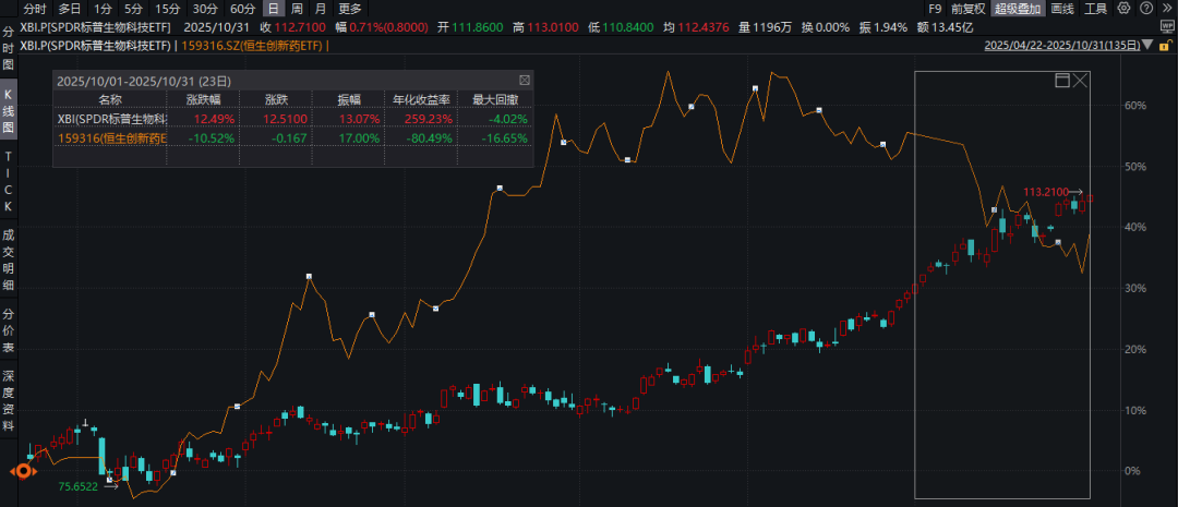 从下图中看,自10月份以来,标普生物科技ETF XBI的涨幅为12.5%,而港股创新药的表现为-10%。