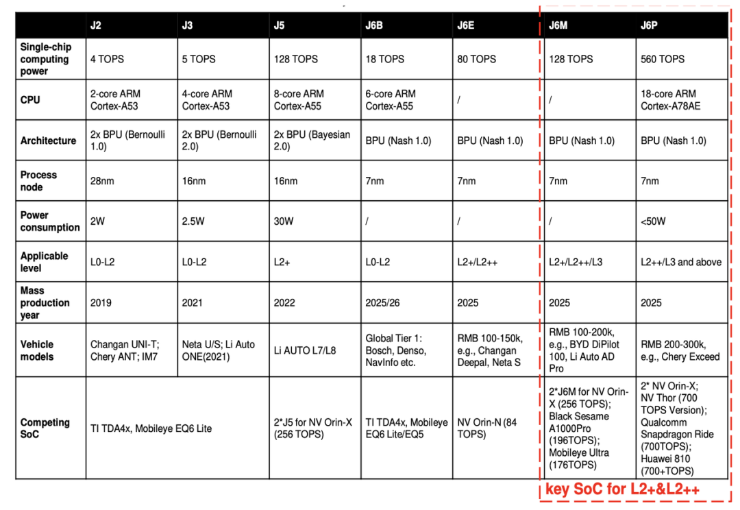 地平线自2017年起专注于智能驾驶SoC领域,其J系列芯片以高能效比、低延迟推理和算法兼容性见长。随着J6P平台的量产临近,地平线将成为除英伟达外唯一能提供L2++解决方案的第三方供应商。