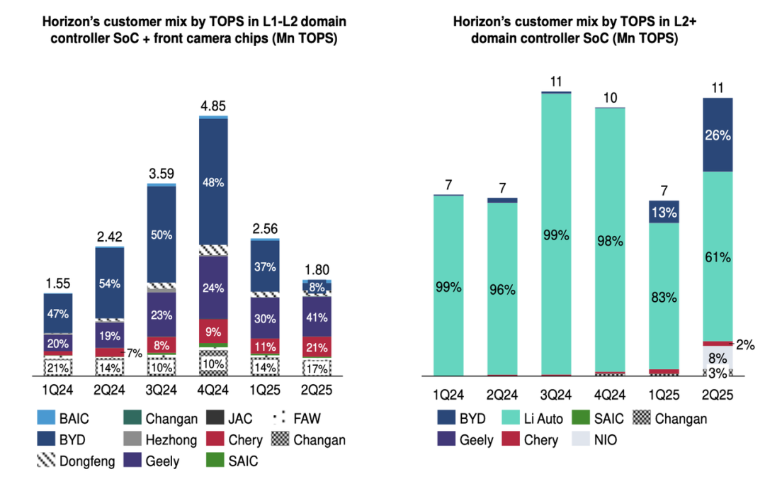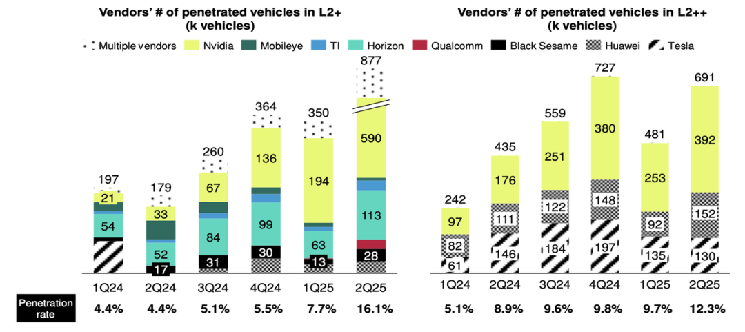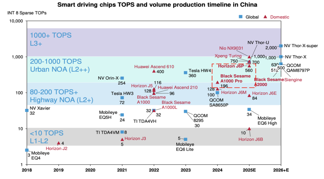 截至2025年,L2+及以上级别的竞争格局已显雏形。英伟达仍是高端市场的标杆,但地平线已在国内市场形成替代效应。黑芝麻智能、Mobileye以及新兴自研芯片厂商Momenta也在快速追赶。