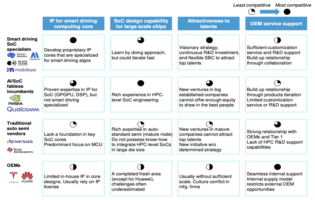 在前一个阶段,智能驾驶更多依赖规则算法和有限传感器融合,对算力需求有限,传统汽车半导体厂商如德州仪器、瑞萨凭借车规可靠性和稳定供货优势占据主导地位。