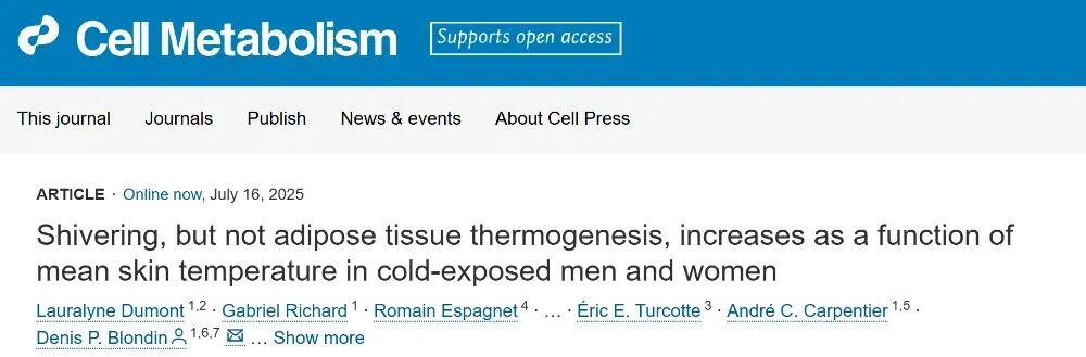 2025年7月,Cell Metabolism发表了一篇题为“Shivering, but not adipose tissue thermogenesis, increases as a function of mean skin temperature in cold-exposed men and women”的文章,该研究通过创新的皮肤温度钳制技术,首次系统地比较了不同冷暴露强度下寒战和脂肪组织产热的贡献,并探讨了性别差异对热调节的影响。这一研究不仅填补了当前领域的空白,还为开发基于冷暴露的个性化治疗方案提供了重要的理论依据。通过精准控制皮肤温度,研究者能够更准确地评估寒战和脂肪组织产热在不同冷暴露强度下的具体贡献,从而为肥胖和代谢性疾病患者提供更有效的体温调节策略。