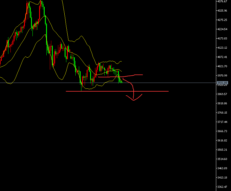 4小时图经过长时间弱势整理后,围绕中轨处承压震荡下行,同时顶开了下轨处的收缩区间,下一目标有望蓄势破位3888低点,4小时图仍是弱势回调结构当中,小时图此前在4030-4050区域横向整理承压,反弹高点在慢慢向下移,而反复逼近回撤低点,蓄力破位的走法,同时短线图均线指标开始形成空头发散,昨日整理后收在低位,今日有望进一步释放空间,同时亚盘就会表现弱势走低。故今日操作亚盘结合破位低点3963作为阻力点。临界点在昨晚反弹的最后一个高点处3976.亚盘在3950-3960一带分别加仓进空防守放在3977.50即可 目标看3900-3880间减个仓破位再下看。