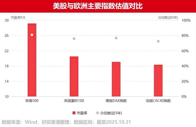 相较于美股,欧洲主要指数市盈率均显著低于标普500,形成了明显的“估值洼地”。