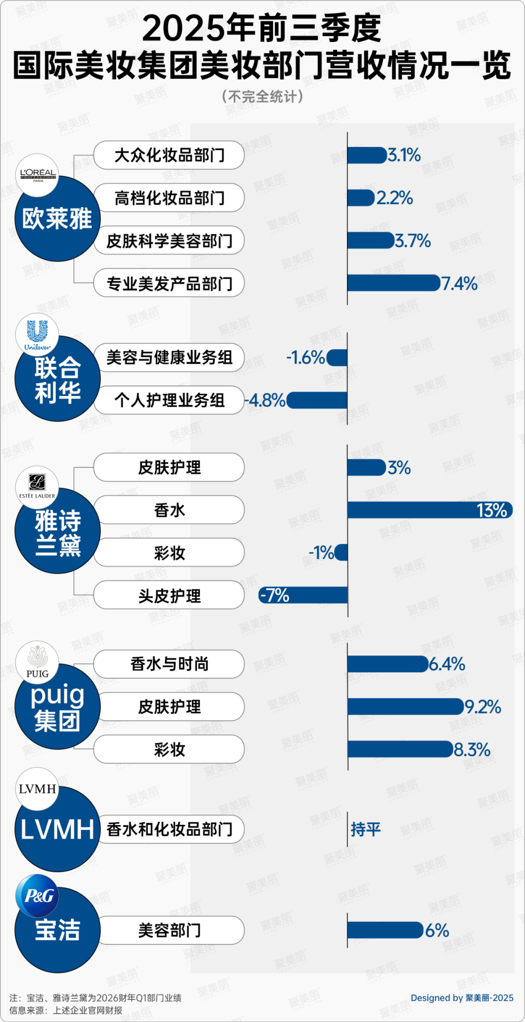 4、前9个月国际美妆集团整体营收同比仅2家(联合利华、LVMH)下滑;
