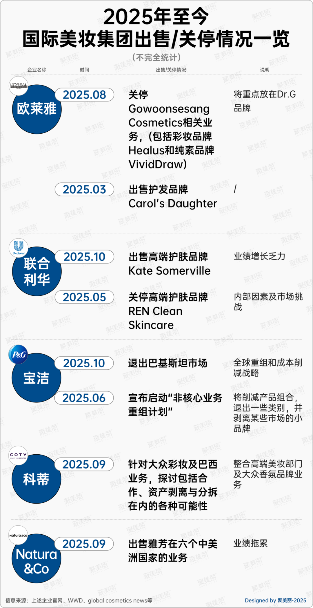 如下图所示,今年以来,包含欧莱雅、联合利华等在内的国际美妆企业,已存在多起出售以及关停品牌业务的情况。值得注意的是,此类行动在下半年发生频率更高,这或许也与经过上半年的运营,仍未能扭转不利局面相关。