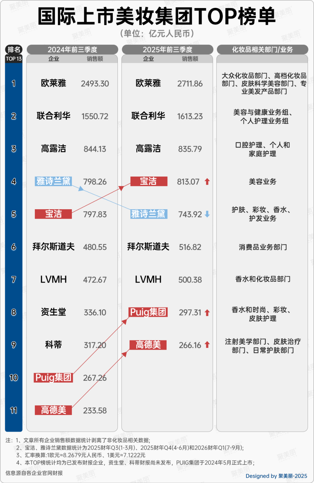 随着高露洁发布财报,最新的国际上市美妆企业排行也已出炉。值得注意的是,截至发稿前,因资生堂、科蒂等财报尚未发布,高德美(注射美学部门、皮肤治疗部门、日常护肤部门)前三季度销售额为37.37亿美元(约合人民币266.15亿元),位列第9。