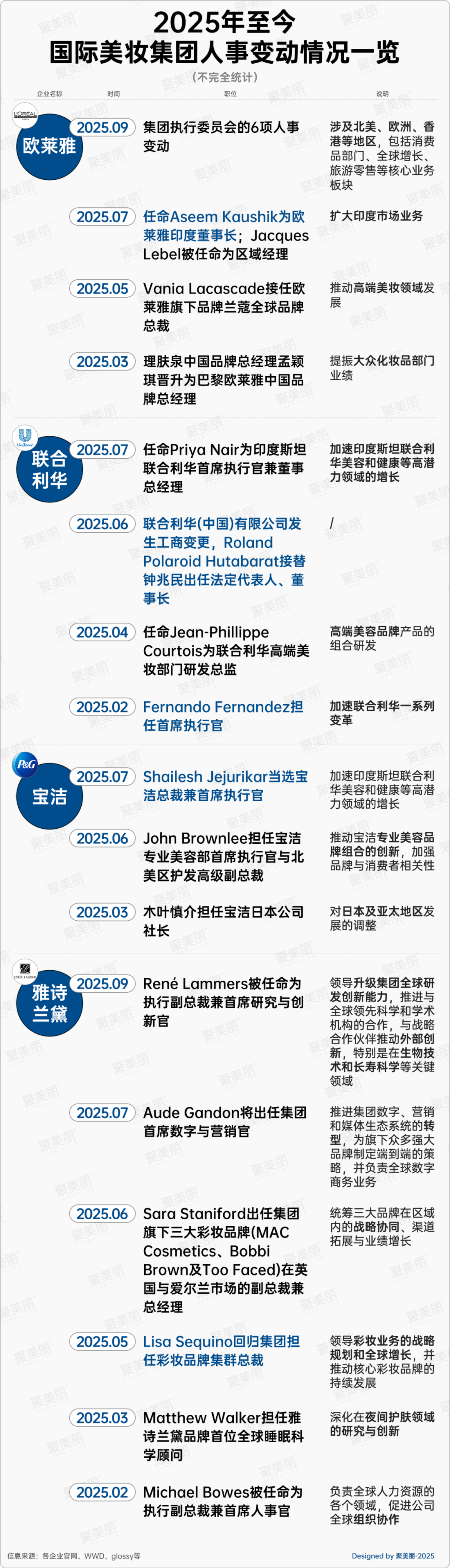 深究国际美妆集团业绩回暖的背后,内部人事变动是原因之一。结合公开资料,聚美丽不完全统计了2025年至今部分国际美妆企业的人事变动情况。其中欧莱雅、联合利华等人事变动最为频繁。