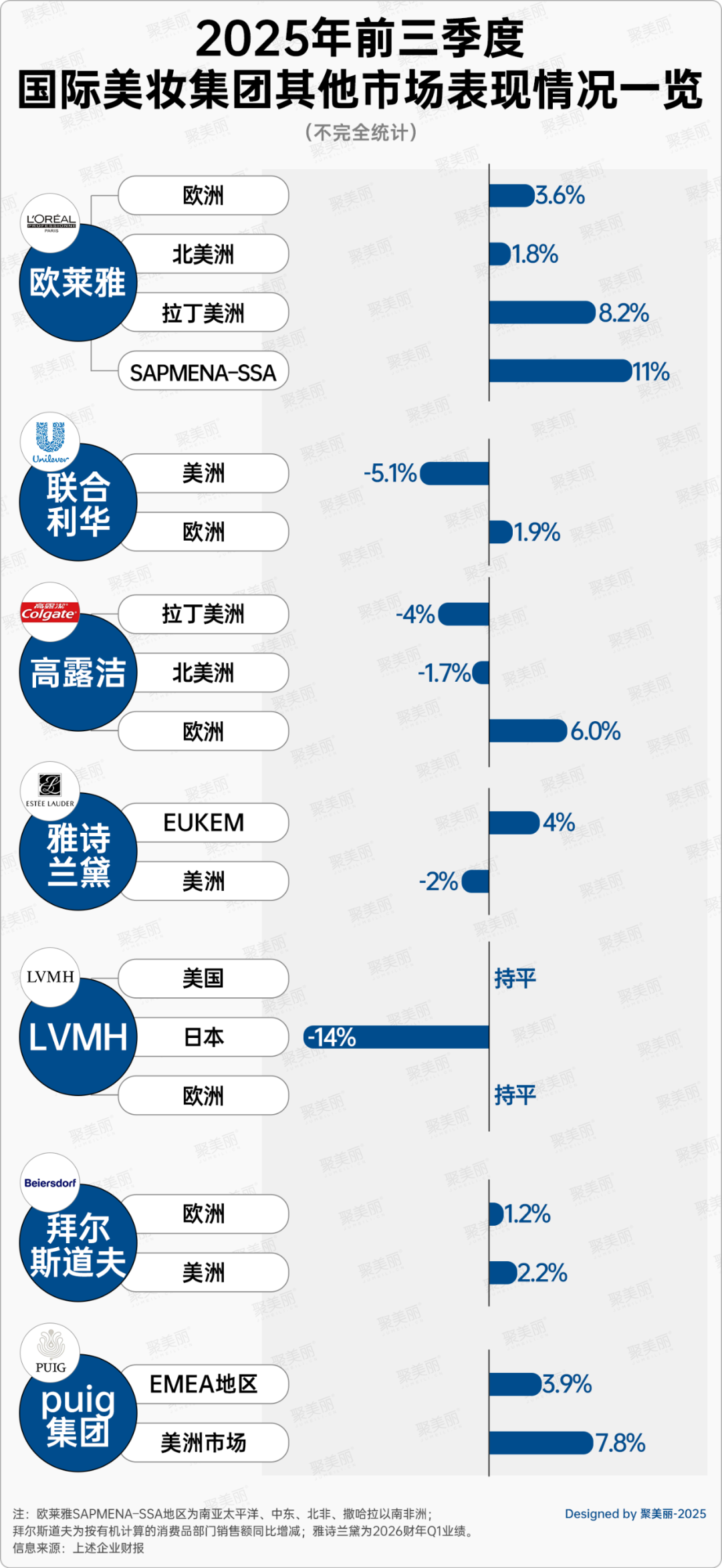 亚太市场虽然回暖,但是作为多家国际集团主要大本营的欧美市场,受关税等因素的影响,与各地区的差距开始拉大。其中,除高露洁外的国际美妆集团,在欧洲市场的涨幅均未超过4%。