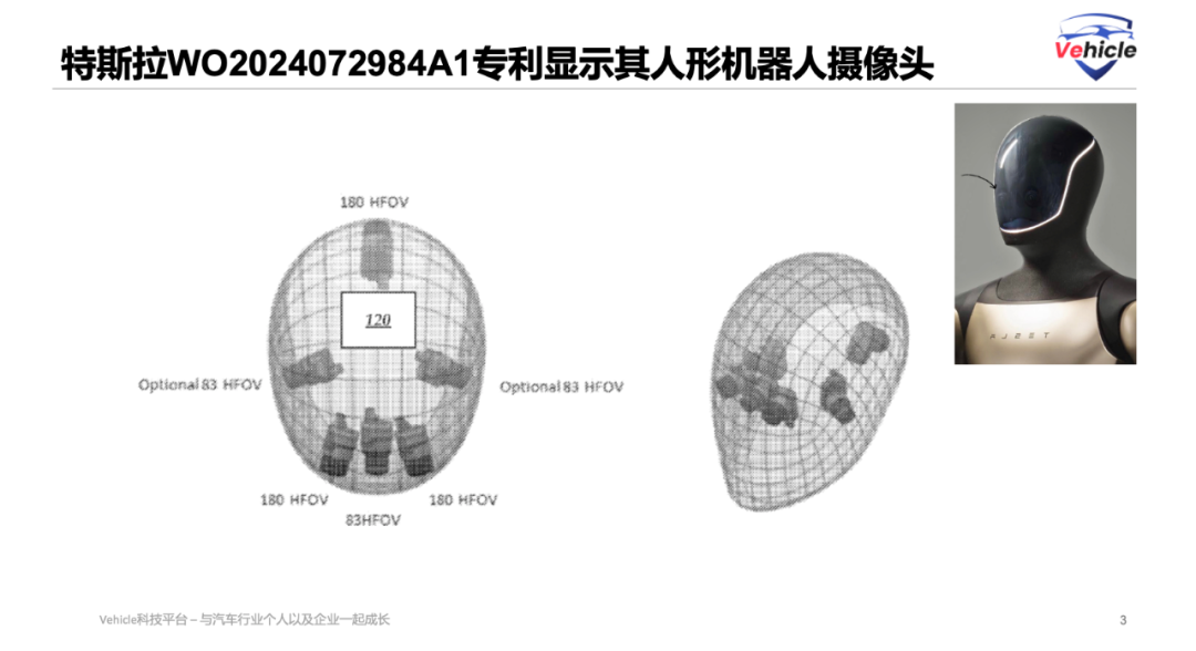 2024年4月特斯拉公开的,专利号为WO2024072984A1的专利显示,特斯拉机器人Optimus采用6个摄像头,全部布置在头部,前向3个,侧向2个,正后1个。