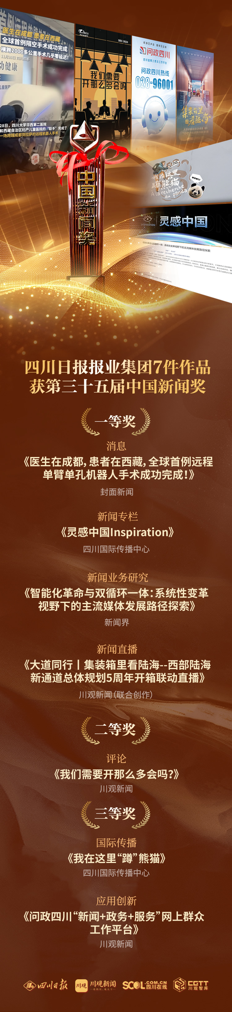 其中,四川日报报业集团有7件作品获奖:一等奖4件、二等奖1件、三等奖2件。这些作品题材广泛、视角多元,既有聚焦国家战略与时代发展的宏大叙事,也有关注民生冷暖与社会热点的微观洞察。让我们一起走进这些获奖作品背后的故事。
