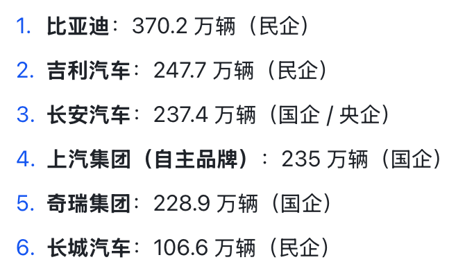 目前,民企已形成差异化竞争优势,比亚迪构建从10万到百万级的全价格带产品矩阵,吉利燃油与新能源双线均衡发展,长城单车均价突破18万元。