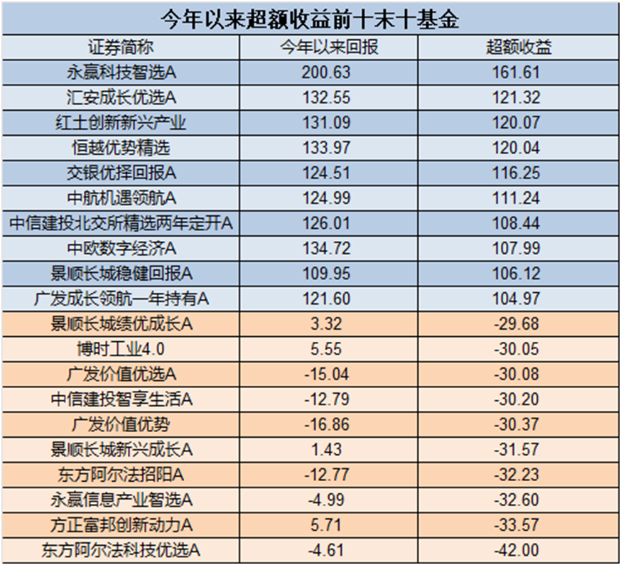 值得注意的是,同样位列末十的基金中,东方阿尔法招阳与东方阿尔法科技优选都是基金经理潘令梓管理的,而景顺长城绩优成长和景顺长城新兴成长均由刘彦春管理,广发价值优选和广发价值优势为王明旭管理。这三为基金经理旗下的基金就占据了6只。