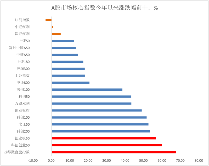 2025年前10个月,A股市场整体上先抑后扬,Wind数据显示,38个A股市场核心指数仅红利指数微跌3.289%,其他37个指数全部上涨,万得微盘股指数以涨幅67.31%位列第一,科技创新板块成为市场最靓的“仔”,科创创业50、创业板50、科创200、北创50、科创100这5个指数的涨幅均超过50%。而债市震荡,中债-总财富(总值)指数以微涨0.48%收红。