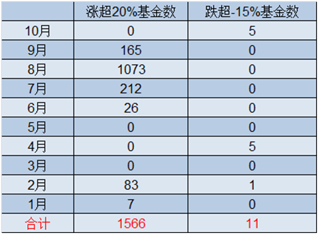 整体上看,今年前10个月基金投资的赚钱效应较好,但回报差异较大。全市场主代码基金中,单月回报超20%的有1566次,而单月跌幅超20%的一次也没有,单月跌幅超15%的共发生11次。其中,长安鑫瑞科技先锋6个月定开,创下单月回报48.39%的年内最高记录。