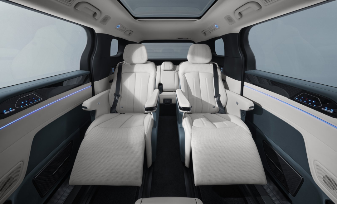 比如,副驾一键切换为“妈妈女王座”,具备4向电动调节与按摩功能;第二排配备父母专属按摩躺椅,支持通风、加热与语音调节,第三排座椅不仅能前后移动,还能完全收纳至后备厢,且支持电动放倒,在收纳状态下,后备厢容积可扩展至2036L。