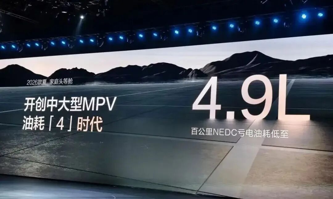 在发布会上,比亚迪夏号称开创了中大型MPV油耗“4”时代,相比与现款的5.3L百公里馈电油耗,2026款比亚迪夏将能耗干到了5以内,百公里NEDC亏电油耗仅为4.9L。