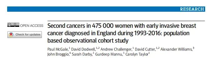 cGale P, Dodwell D, Challenger A, et al. Second cancers in 475 000 women with early invasive breast cancer diagnosed in England during 1993-2016: population based observational cohort study[J]. BMJ. 2025 Aug 27;390:e083975. DOI: 10.1136/bmj-2024-083975.