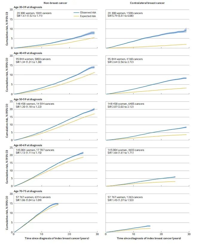 20-39岁组:对侧乳腺癌6.9% vs 预期1.3%,绝对差5.6%;非乳腺癌差值仅1.8%;