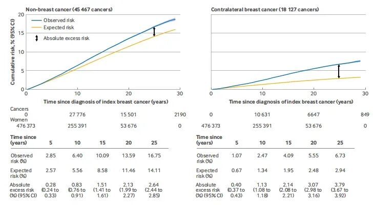 2025年7月,BMJ发表了一篇题为“Second cancers in 475 000 women with early invasive breast cancer diagnosed in England during 1993-2016: population based observational cohort study”的文章,利用大规模人群数据,填补了这一领域的空白,对临床而言,这份“风险地图”让术后随访从模糊推荐走向个体化数字沟通,也为未来减毒治疗策略提供可衡量的收益-损害天平。