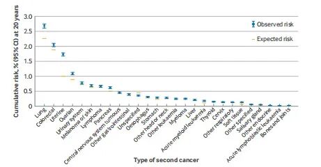 图3 指数乳腺癌确诊后20年,各类型非乳腺癌的累积风险(含95%置信区间),按观察到的20年风险由高至低排序