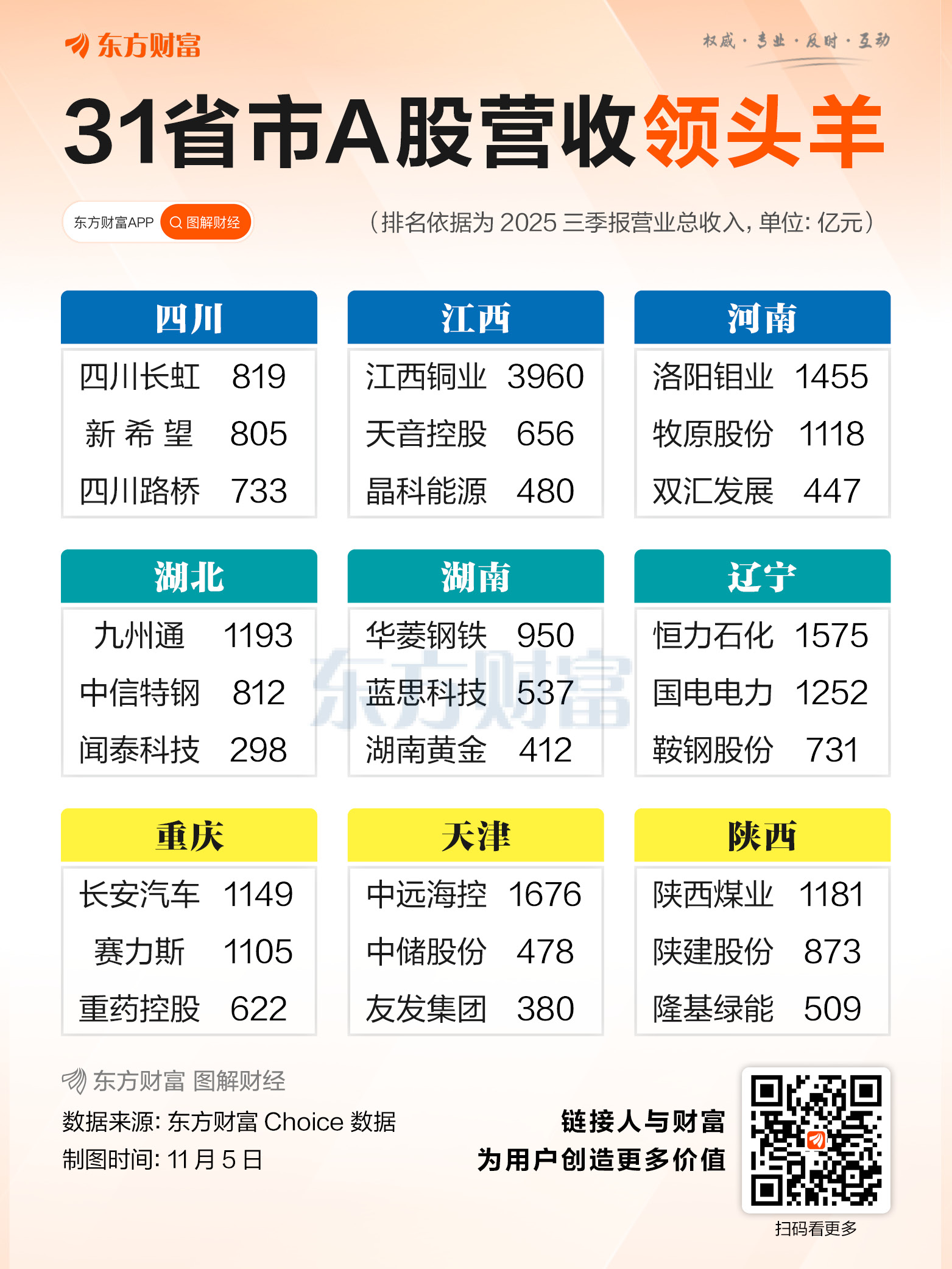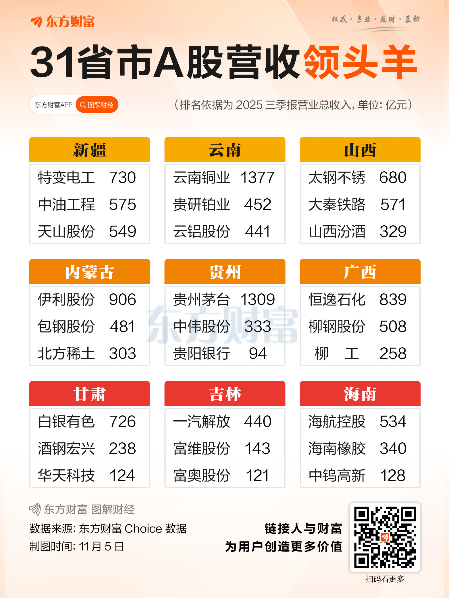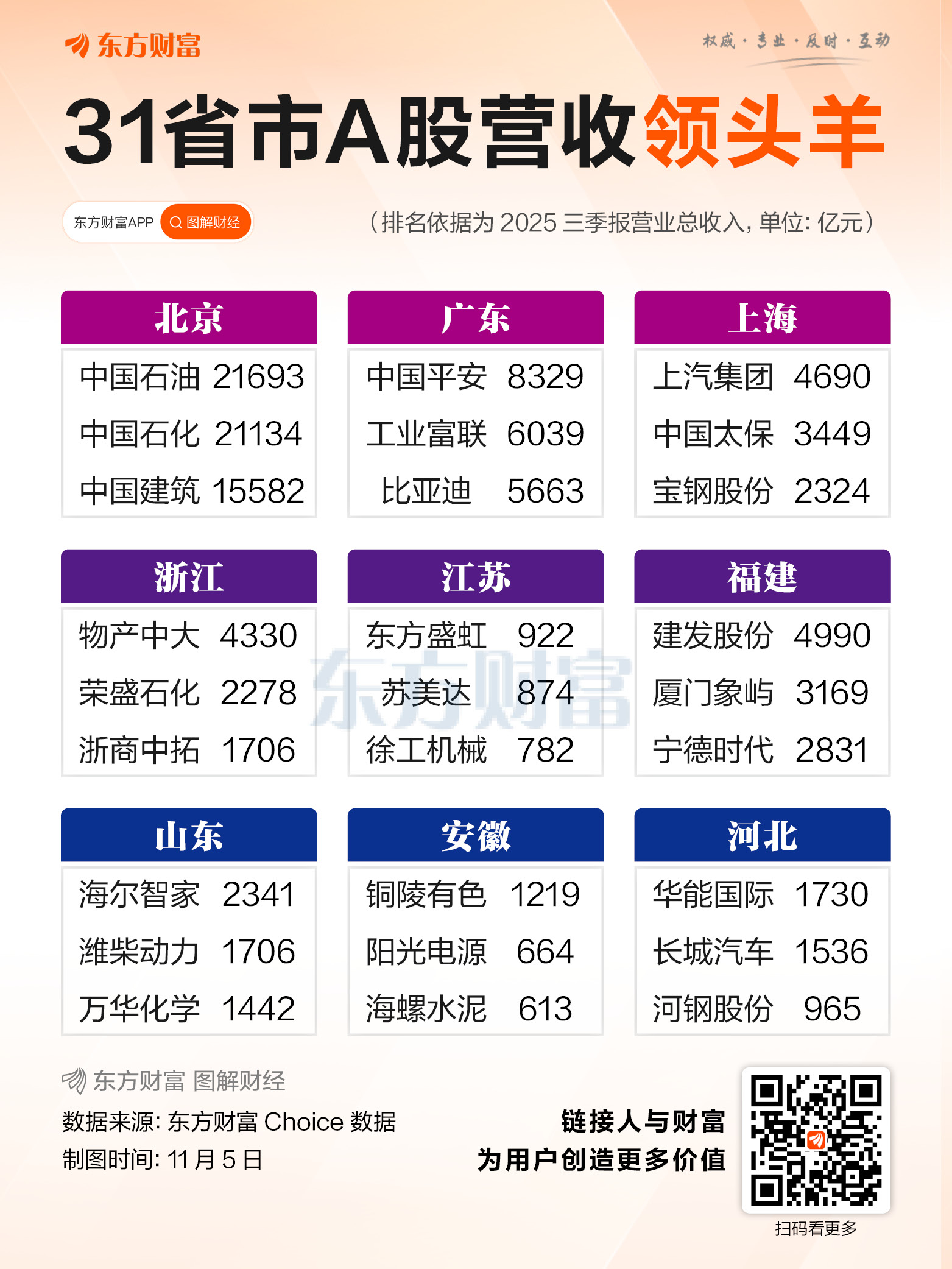 近日,A股上市公司三季报披露已经收官,本文依据东方财富Choice数据,筛选出了全国31个省市A股上市公司总营收前三甲作为“领头羊”。