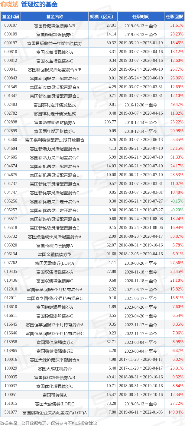 俞晓斌先生:硕士,自2007年7月至2012年10月任上海国际货币经纪有限公司经纪人;2012年10月加入富国基金管理有限公司,历任高级交易员、资深交易员兼研究助理,曾任富国新趋势灵活配置混合型证券投资基金基金经理。2016年12月起任富国泰利定期开放债券型发起式证券投资基金基金经理,2017年11月起任富国天源沪港深平衡混合型证券投资基金、2017年11月20日至2020年4月17日担任富国天成红利灵活配置混合型证券投资基金基金经理,2018年8月至2019年10月任富国优化增强债券型证券投资基金、富国可转换债券证券投资基金、富国颐利纯债债券型证券投资基金基金经理,2018年8月23日至2020年4月17日任富国臻选成长灵活配置混合型证券投资基金基金经理,2018年12月起任富国两年期理财债券型证券投资基金,2019年3月起任富国天盈债券型证券投资基金(LOF)、富国稳健增强债券型证券投资基金、富国祥利定期开放债券型发起式证券投资基金、富国嘉利稳健配置定期开放混合型证券投资基金基金经理,2019年5月至2023年1月19日任富国目标收益一年期纯债债券型证券投资基金基金经理。2019年6月至2020年7月10日任富国新活力灵活配置混合型发起式证券投资基金、富国科创主题3年封闭运作灵活配置混合型证券投资基金基金经理,2019年6月至2019年9月任富国新优选灵活配置定期开放混合型证券投资基金基金经理。具有基金从业资格。2019年3月至2020年3月31日担任富国新收益灵活配置混合型证券投资基金基金经理。2019年3月7日至2020年3月31日担任富国新优享灵活配置混合型证券投资基金基金经理。2018年12月5日至2020年4月16日担任富国金融债债券型证券投资基金基金经理。2019年3月7日至2020年4月16日担任富国收益增强债券型证券投资基金基金经理。2017年11月20日至2020年4月17日担任富国天源沪港深平衡混合型证券投资基金基金经理。2019年5月24日至2020年6月10日担任富国新回报灵活配置混合型证券投资基金基金经理。2019年6月1日至2020年7月10日担任富国新机遇灵活配置混合型发起式证券投资基金基金经理。曾任富国科创主题3年封闭运作灵活配置混合型证券投资基金基金经理。自2019年03月起任富国稳健增强债券型证券投资基金(原富国信用增强债券型证券投资基金)基金经理;自2020年11月起任富国双债增强债券型证券投资基金基金经理;自2021年06月起任富国泰享回报6个月持有期混合型证券投资基金基金经理;自2022年11月起任富国恒享回报12个月持有期混合型证券投资基金基金经理。