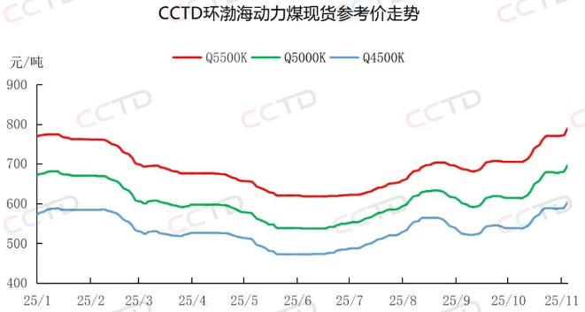 本周以来,随着产地市场煤价持续快速上涨,贸易商发运到港成本上升,加之中下游环节煤炭库存处于同比偏低水平,市场看涨情绪不断升温,卖方报价涨幅逐步扩大。截至11月5日,“CCTD环渤海动力煤现货参考价”5500K、5000K、4500K三个规格品价格分别收于788、695、602元/吨,日环比分别上涨9、9、8元/吨,较前期低点分别上涨18、18、15元/吨,较年初高点均上涨14元/吨。