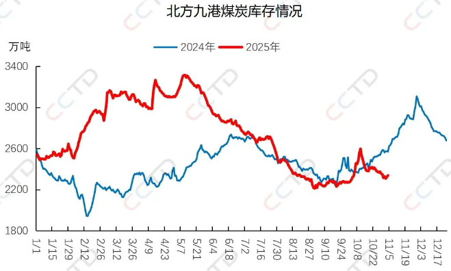 近期,北方港口库存持续低位运行,CCTD中国煤炭市场网监测数据显示,截至目前,北方九港煤炭库存已下降至2300万吨左右,同比下降9%左右。后期来看,产地煤炭供应有望增加,但增量空间或受限,矿方向港口的发运增量或不明显,而终端用户在库存水平同比偏低的情况下,或仍存在补库需求,因此预计短期内北港库存提升进程或较为缓慢。