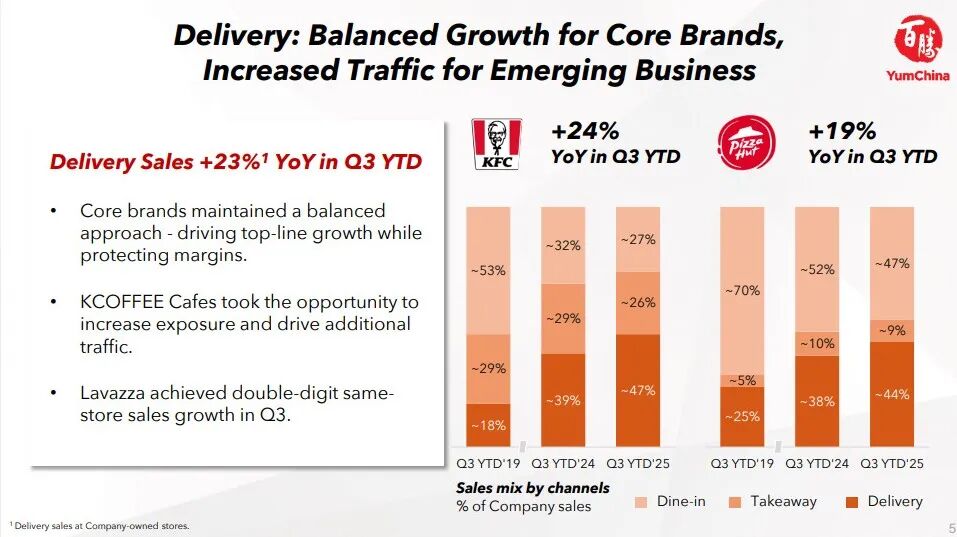 财报显示,百胜中国在第三季度外卖销售额同比增长23%,约占公司总销售额的51%,去年同期仅为40%。