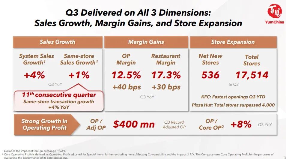 总体来看,百胜中国在第三季度的各项经营指标稳中向好。