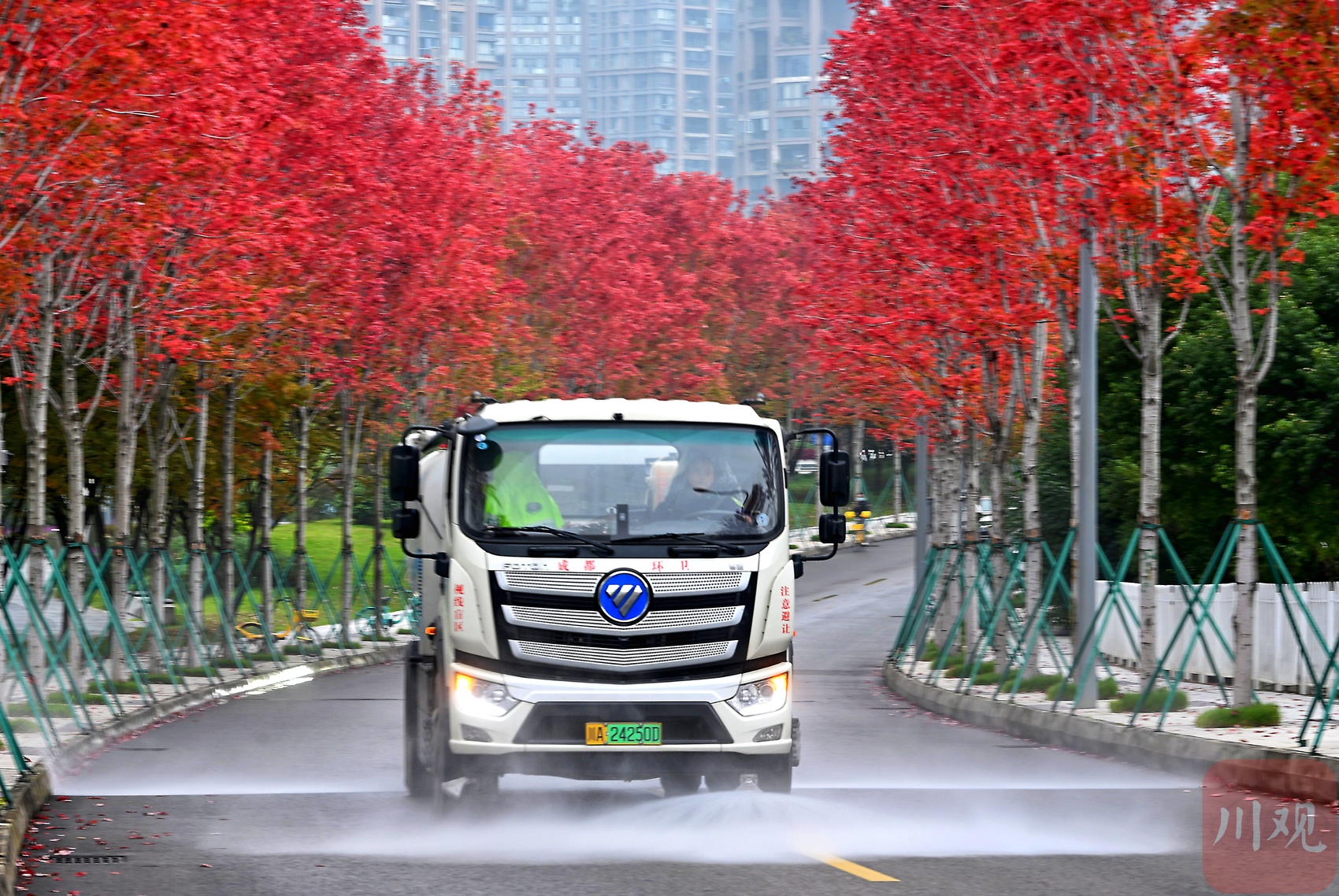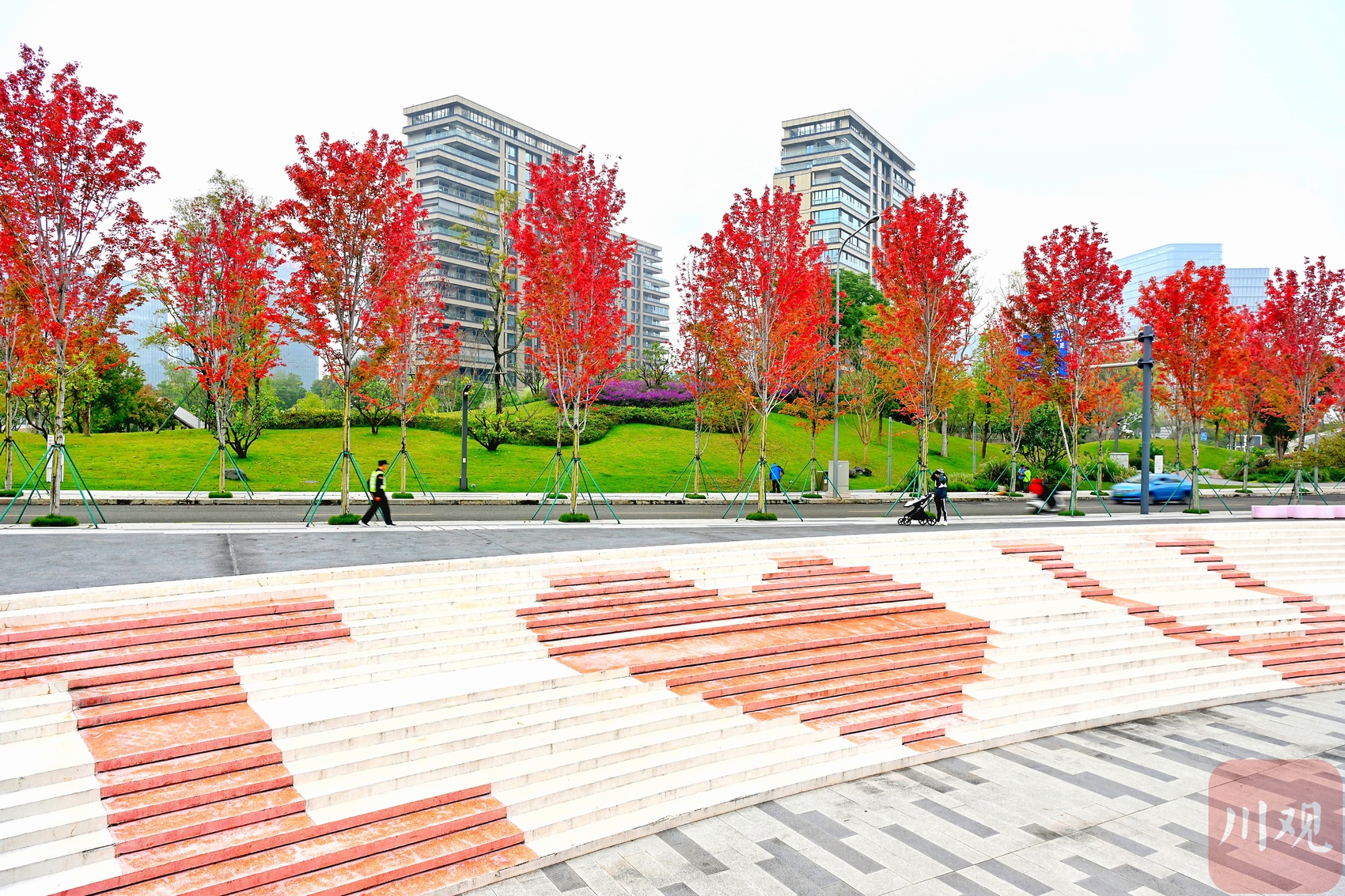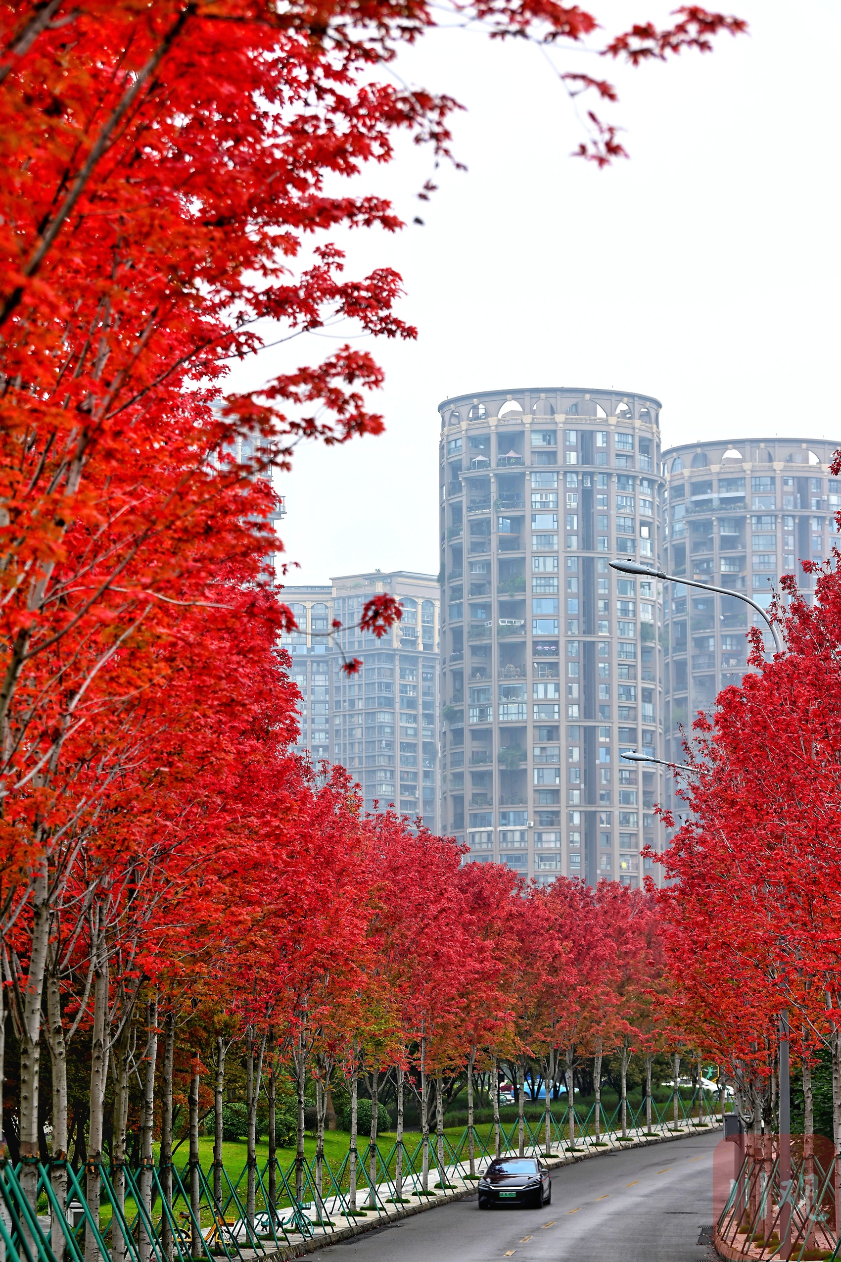 在南门国华街的锦江沿岸,队列整齐的红枫正进入最佳观赏期。叶片如焰火般随风摇曳的红枫与江面上追逐的白鹭相映成趣,引来不少路人驻足取景,用镜头定格这份 “锦江限定” 的秋意。