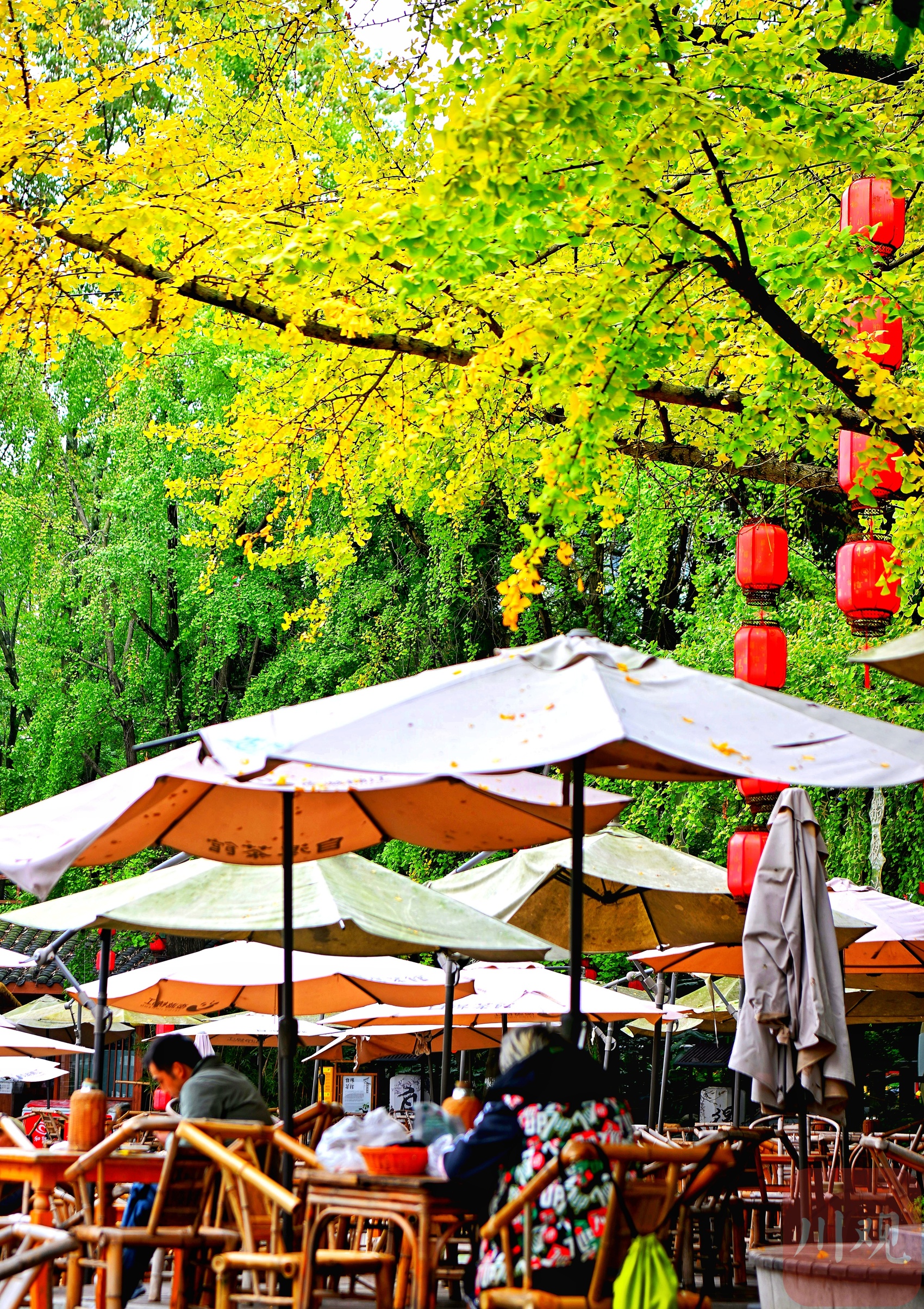 在市中心活水公园内,又是另一番静谧景致。临河茶铺旁,数株高大银杏已显现出青黄交织的渐变色彩。茶客们临江而坐,一边品茗一边赏叶,构成老成都特有的秋日闲趣。据了解,这座依府南河而建的生态公园,因独特的滨水景观,每年秋天都会成为市民赏景的热门去处。