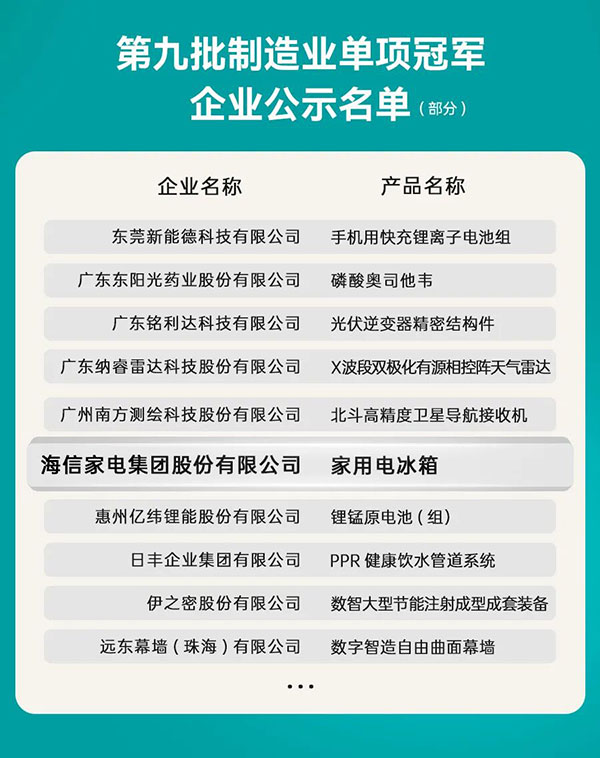 近日,广东省工业和信息化厅公示了全省入围国家第九批制造业单项冠军企业名单,海信家电(SZ 000921,HK 00921)凭借家用电冰箱产品入选名单。这是继海信日立之后,海信家电再次入选这一国家级名单,彰显了公司在家电领域持续领先的综合实力。
