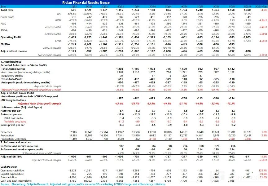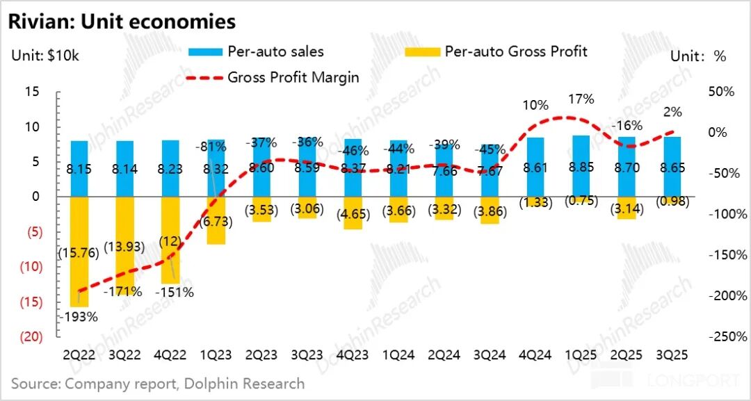 ① 汽车毛利率环比大幅上行:本季度报表端的汽车毛利率从上季度-36% 环比上行了 25 个百分点至本季度-11.4%,环比上行幅度很大。而与二季度一样,三季度 Rivian 同样受到无碳积分收入确认(纯毛利业务),以及关税对采购成本冲击的负面影响,但卖车毛利率仍然有了超预期的环比大幅提升表现。