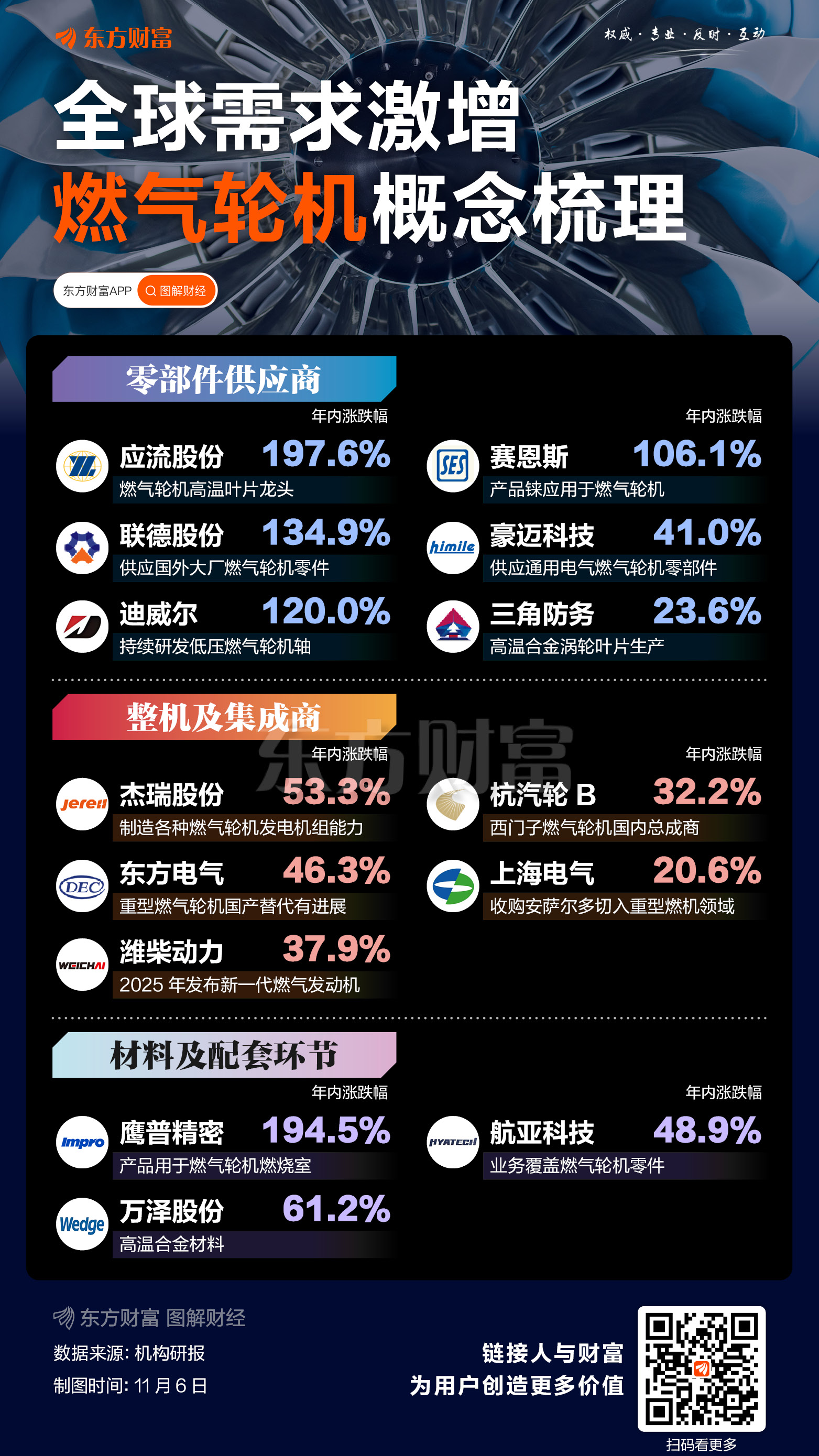 华泰证券研报显示,AI数据中心拉动电力需求,燃气轮机为匹配需求增长的优质选择,全球燃气轮机销量/订单有望持续高增,主机厂扩产计划明确。热端动力涡轮叶片/主轴等部件价值量较高,此前主要零部件供应商为海外铸锻件公司,高端铸造与锻造生产的零部件扩产周期较长,因此国内厂商有望借此机会切入全球供应链。