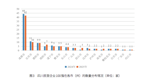 各地也纷纷打出“组合拳”,激活民营经济新动能。从区域分布来看,百强企业分布于全省16个市(州),其中,成都、宜宾、德阳上榜企业数量位居前三名,分别是42家、10家、9家,绵阳、眉山较上年各增加2家。