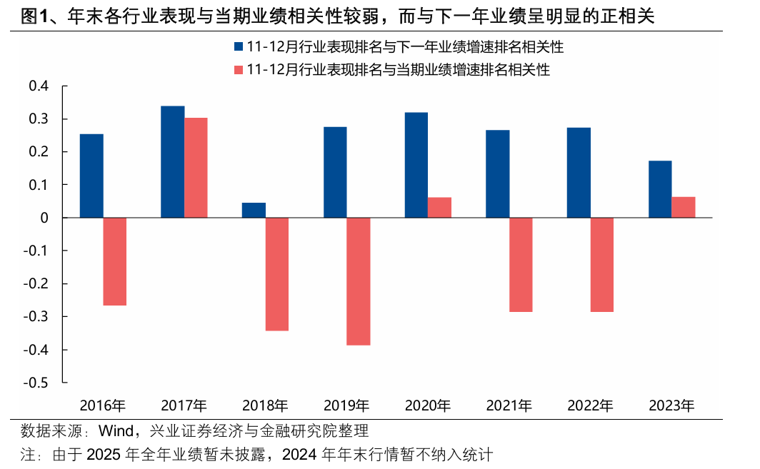 随着年末市场提前抢跑定价下一年景气,景气预期变得更加重要,而当期景气对股价的影响减弱。复盘自2016年以来的年末行情(11-12月),从后验视角来看,各行业表现排名与其下一年业绩增速呈现较强的正相关,而与当期的业绩增速相关性较弱、甚至呈现负相关。从这个角度来看,投资者往往在年底寻找下一年景气更占优的行业提前进行布局,核心是寻找下一年强者恒强或者困境反转的方向。