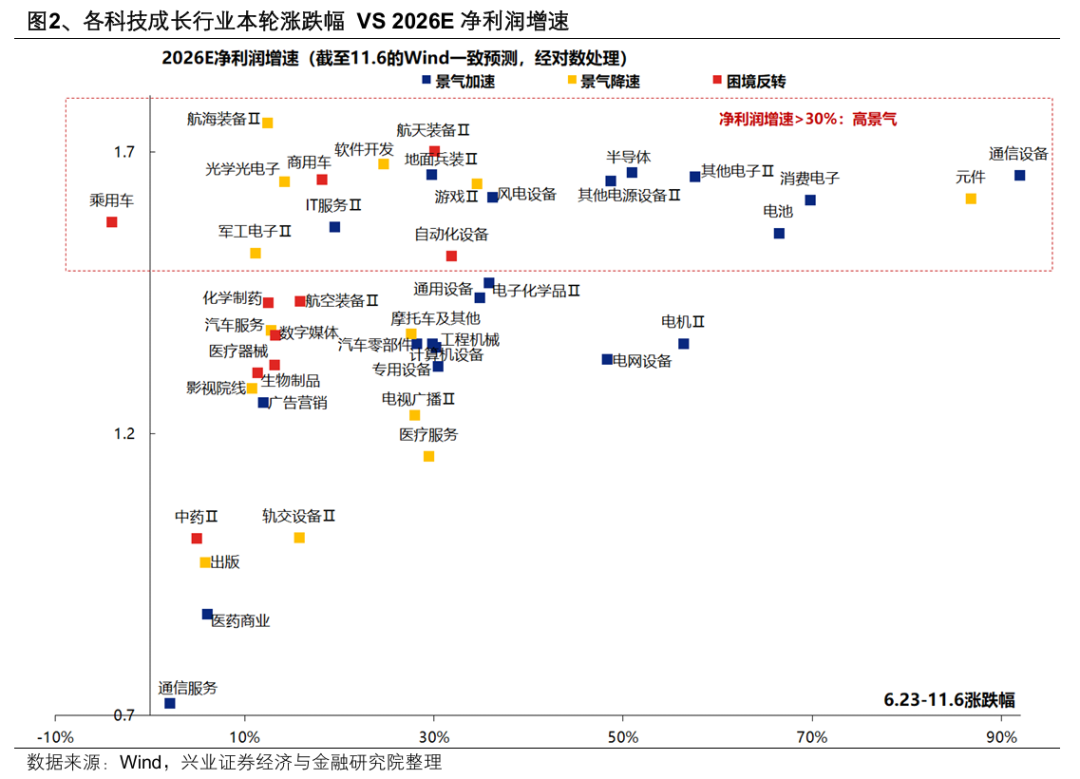 • 明年高景气(预期净利润同比增速>30%)且景气加速:包括AI硬件(通信设备、消费电子、半导体)、新能源(电池、风电设备)、军工(地面兵装)、计算机(IT服务),其中风电设备、地面兵装、IT服务本轮涨幅偏低。