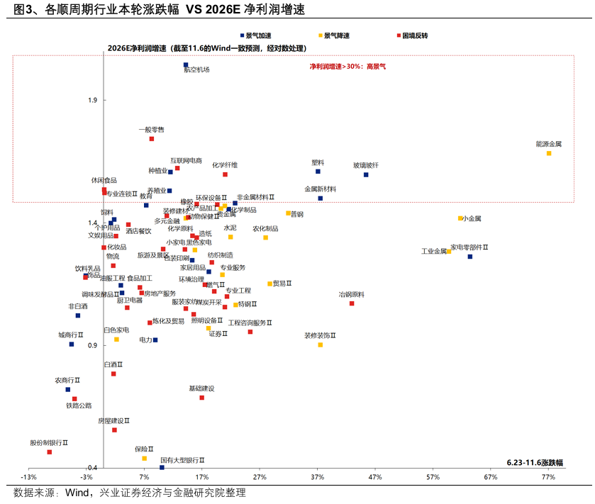 • 明年高景气(预期净利润同比增速>30%)且景气加速:包括航空机场、建材(玻璃玻纤、塑料、非金属材料)、金属新材料、农业(种植业、养殖业)等。