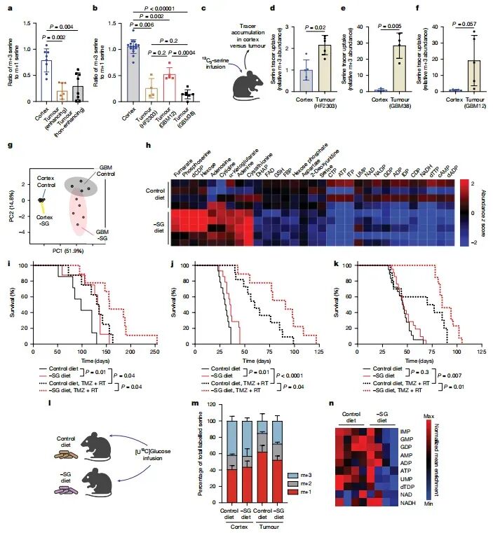 基于上述发现,研究团队通过限制丝氨酸摄入,发现−SG饮食使血浆丝氨酸下降约25%,循环m+1-丝素酸比例同步降低。HF2303模型中,该饮食令肿瘤m+3-丝氨酸升高2倍,而葡萄糖衍生的IMP、UMP、GMP标记分别下降28%、35%与24%(P<0.01,图3n)。PCA显示肿瘤代谢谱偏移,皮层几乎不变(图3h)。这证实“外购”被切断后,GBM被迫把有限糖碳先用于合成丝氨酸,从而暴露核苷酸池的“瓶颈”。