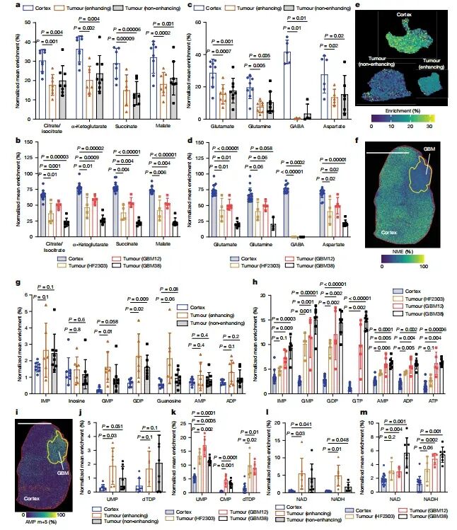 在皮层,谷氨酸、GABA、天冬氨酸的m+2/m+4同位素体占总池30–50%;在GBM,同一指标降至5–10%,GABA几乎检测不到13C信号(P<0.001,图1c-d)。转录数据印证:GABA受体及合成酶(GAD1/2)表达下调2–5倍。这既解释了GBM患者常见的高度兴奋性神经网络,也提示肿瘤通过“代谢沉默”逃避神经微环境抑制。