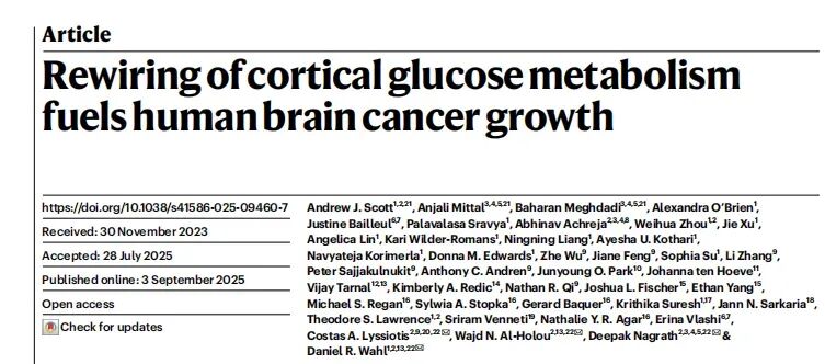 cott AJ, Mittal A, Meghdadi B,et al. Rewiring of cortical glucose metabolism fuels human brain cancer growth[J]. medRxiv [Preprint]. 2023 Oct 25:2023.10.24.23297489. Update in: Nature. 2025 Oct;646(8084):413-422.DOI: 10.1038/s41586-025-09460-7.