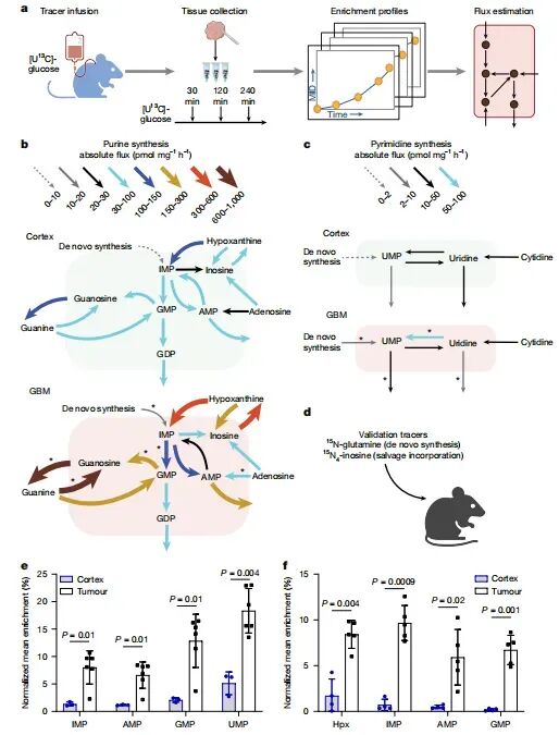 动态代谢通量分析(MFA)给出绝对值:GBM38模型中,IMP从头合成速率为180±30pmolmg-1h-1,显著高于皮层的70±15(非重叠95%CI,图2b);GMP支流通量同样升2.4倍。15N-酰胺谷氨酰胺示踪再验证:m+3-GMP在肿瘤富集度22%vs皮层9%(P=0.004,图2e)。这是首次在人体内定量“葡萄糖-核苷酸”通量,直接说明GBM将糖碳用于DNA/RNA合成的规模。